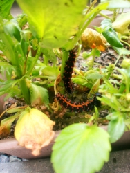 勇者の母 パンジーについていた、超キモチワルイ危険的なテイストの幼虫。キレイなチョウチョ(ツマグロヒョウモン)になるというので捕獲、飼育。現在蛹。遅くなりましたが、今朝名前をつけました。「エイリ」くんと「アン」ちゃん。宇宙からやってきたと思われますw