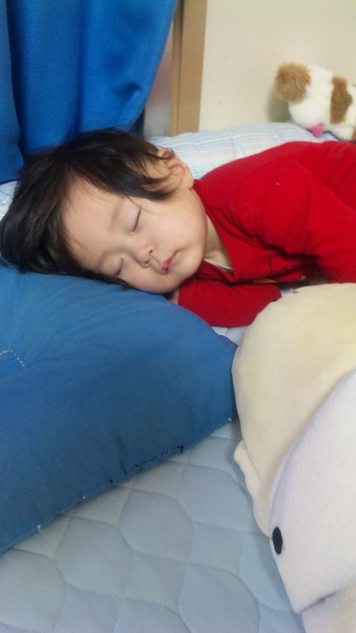 クタクタに疲れて家に着くと、車の後部座席のベビーシートで熟睡する勇者カイ。