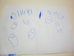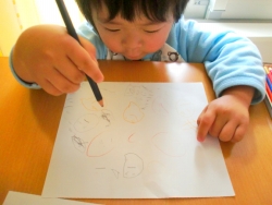 輪郭や丸を描いて、「おめめは?おはなは?」と促すと、