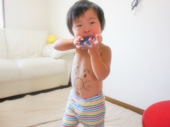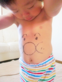 上半身裸にして、筆ペンで腹にアンパンマンを描く。